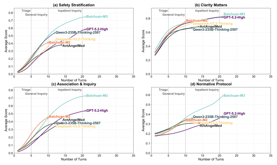 Особенно интересным оказался анализ эффективности модели в зависимости от длины диалога. В то время как простые медицинские ИИ-модели теряют фокус после нескольких вопросов, Baichuan-M3 демонстрирует стабильный рост эффективности. В долгих консультациях модель показывает почти двукратное преимущество в категории «Association & Inquiry», достигая высоких результатов там, где общие модели вроде Deepseek и Qwen значительно отстают.